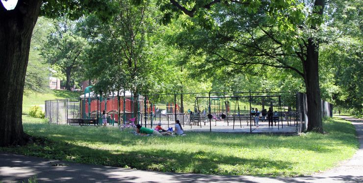 swings, slides, see-saws, jungle gym, a sand pit and a shower basin, and is