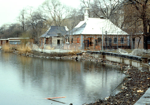 And here's a photo of the abandoned and burnt-out 1943 boathouse in the 1970s, found on the Forgotten New York website: