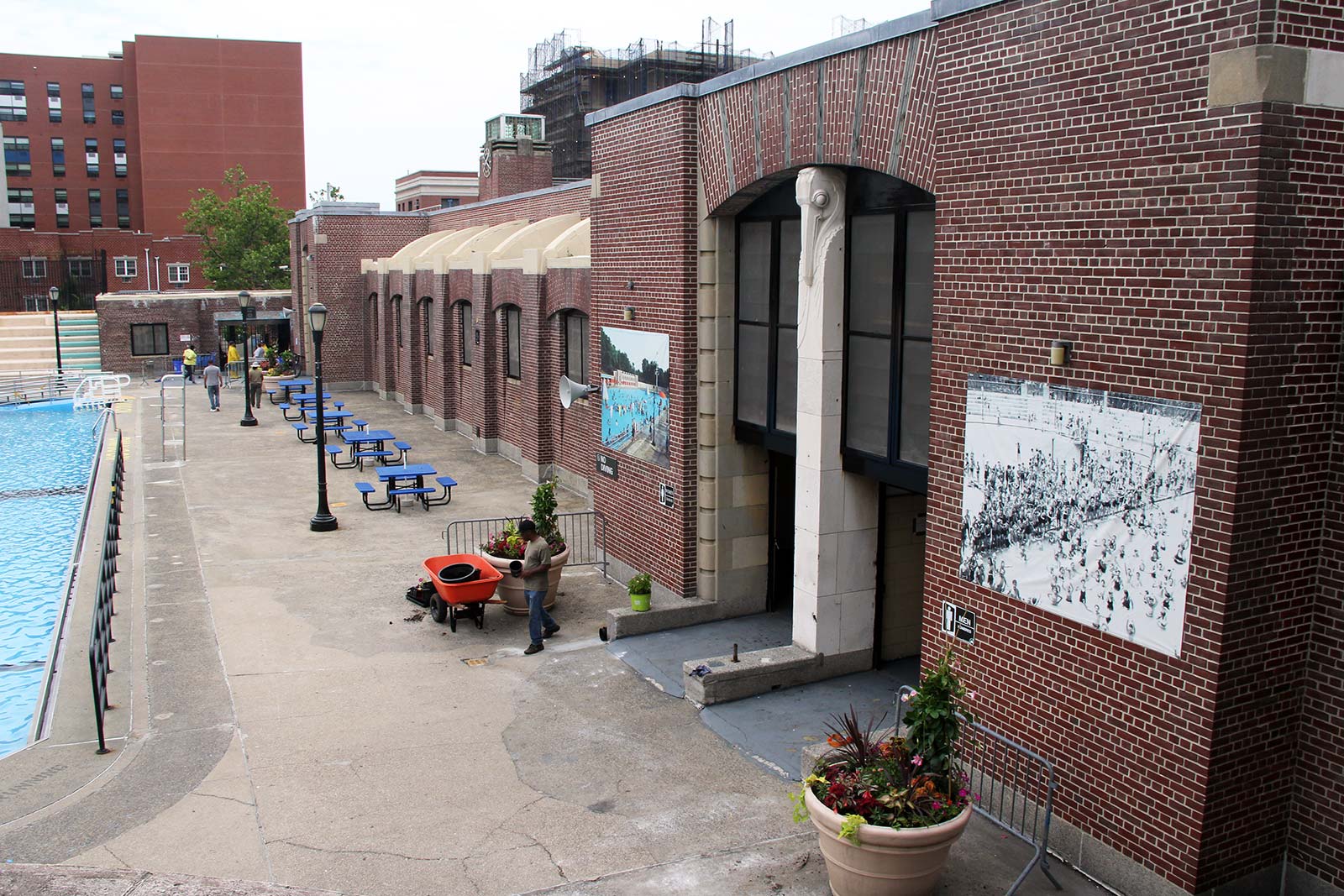 bathhouse photographed June 24, 2014, during renovations. Note the Arte Moderne Ibis bird topping the white pedestal separating the women's and men's restrooms entrances. The big photos show the pool "now" and "then".