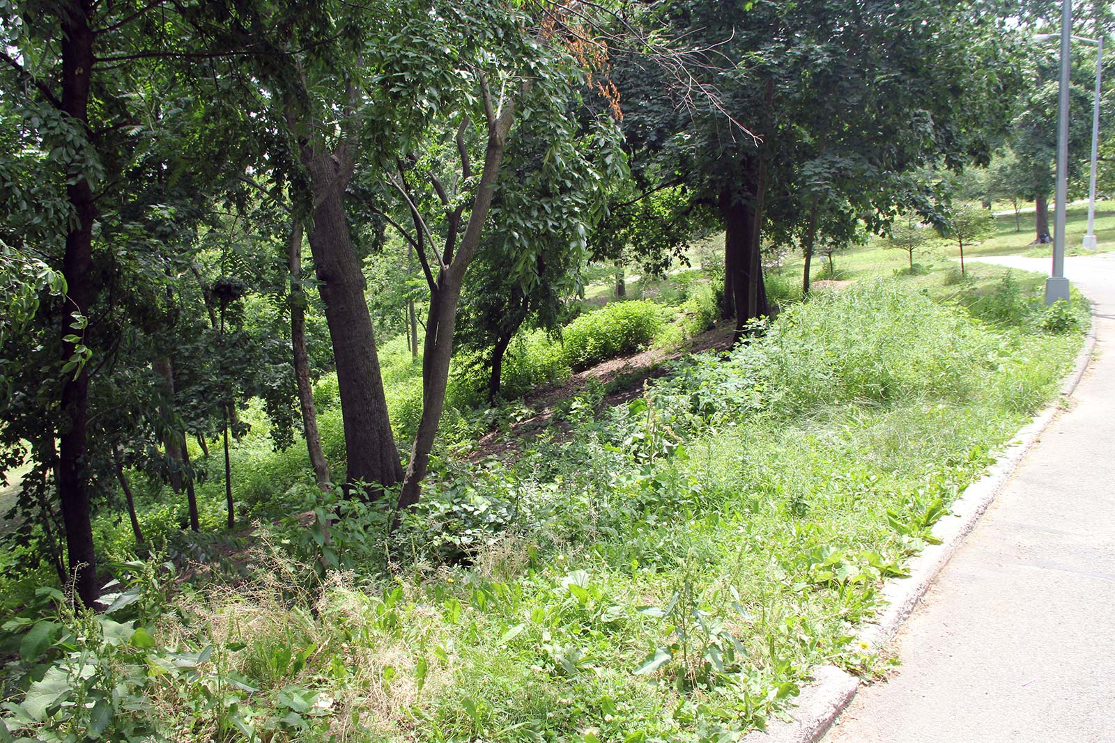 Claremont Park June 2014, showing the steep dropoff on the east side.