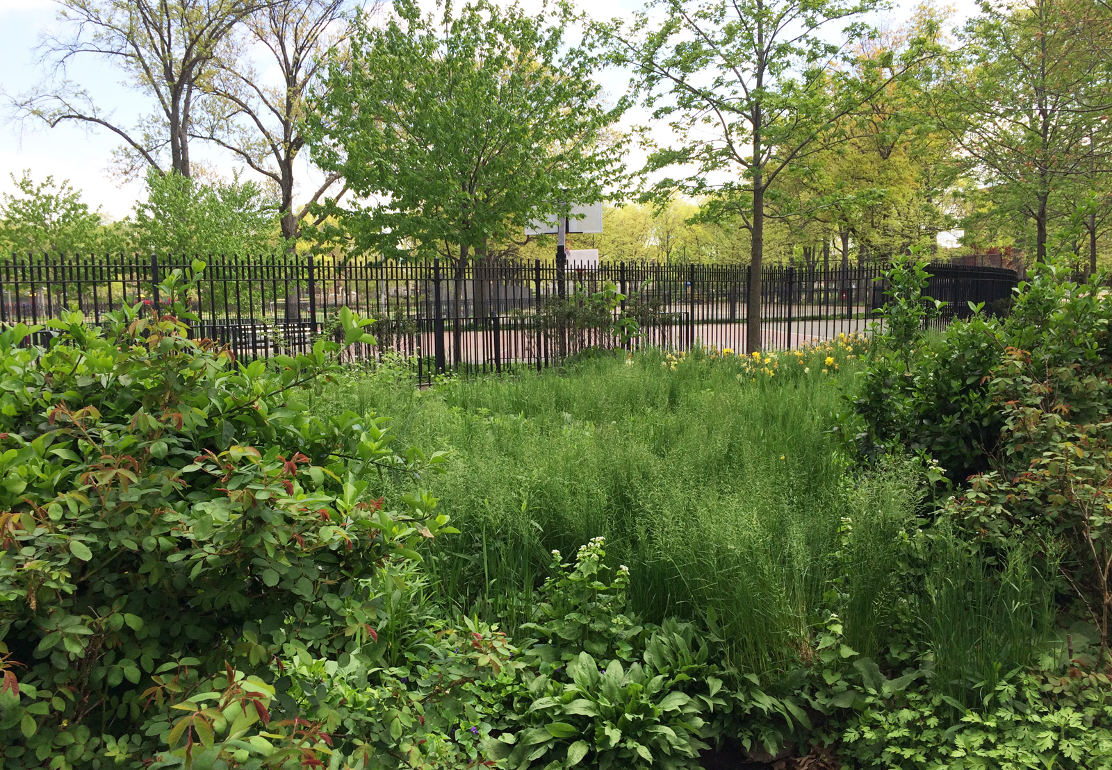 , May 2017: Foliage along the lower promenade at the basketball courts.