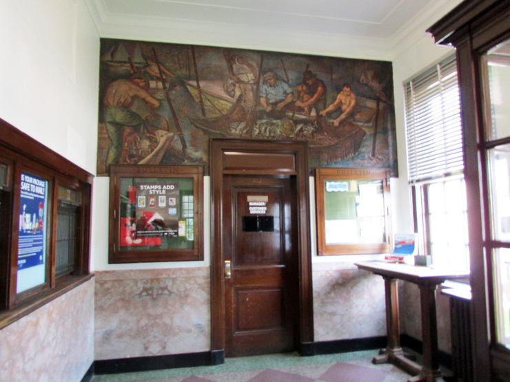 Phoebus Post Office, Hampton, Virginia. Interior, photographed May 31, 2017. Unlike most 1930s Post Offices, this one's interior is virtually unchanged since it it was built. The woodwork, the vestibule, the glass-cased wood-frame bulletin boards, the marble wainscotting and trim, and the Depression-era mural Chesapeake Fishermen by William H. Calfee[1,2]. It's like going back in time.