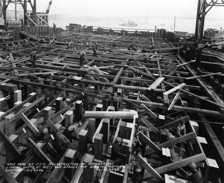 Navy Yard NY Works Progress Administration reconstruction of Shipways Nš1. looking North at posts and braces for working platform. 5 May 1941.