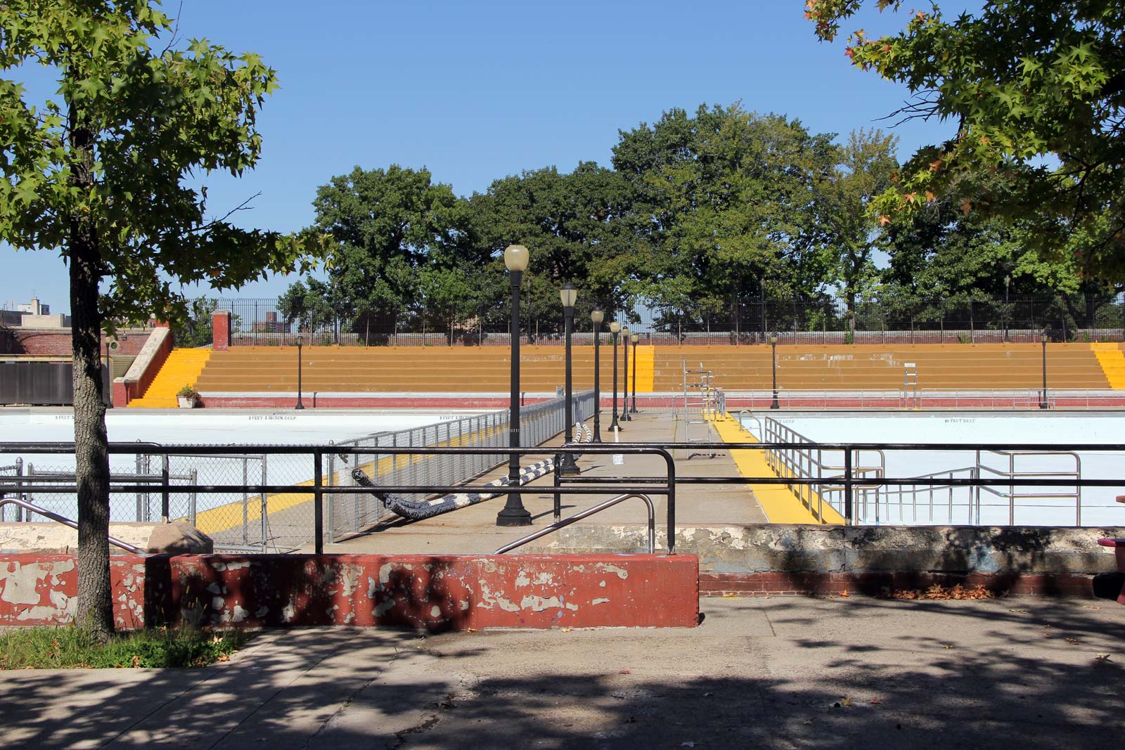 The Highbridge Pool showing the piece that separates the wading pool (left) from the swimming pool (right), September 2019.