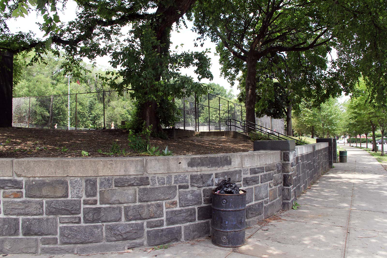 along Clay Avenue at Claremont Parkway, June 2014, showing the stone retaining wall and fenced-in basketball courts.