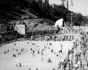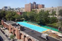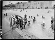 Jackie Robinson Park is an immense 10-block-long installation in Harlem, New York City, originally called Colonial Park (officially, but people in the neighborhood called it Bradhurst Park). In the mid-1930s a massive two-year-long New Deal construction project transformed a little-used bare-bones park into a world-class swimming and recreation complex for the long-underserved people of Harlem. The result, originally called Colonial Play Center, included a huge swimming pool, an equally huge bathhouse and recreation center, a diving pool, a bandshell with a large outdoor terrace for dancing, a playground for small children, a wading pool and bathhouse for older children, athletic fields and game courts for teens and grownups, and natural parkland. It made an enormous difference in the lives of Harlem residents, especially in the blistering heat of Summer 1936. In 1978 the park's name was changed to honor Jackie Robinson. In 2007 it was designated a New York City landmark. In March 2022 new historical marker acknowledging the WPA was installed by Parks Department at the Play Center's main entrance.