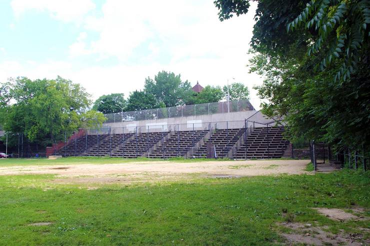 Left to right: the main entrance, the bleachers, the diamond (not very well