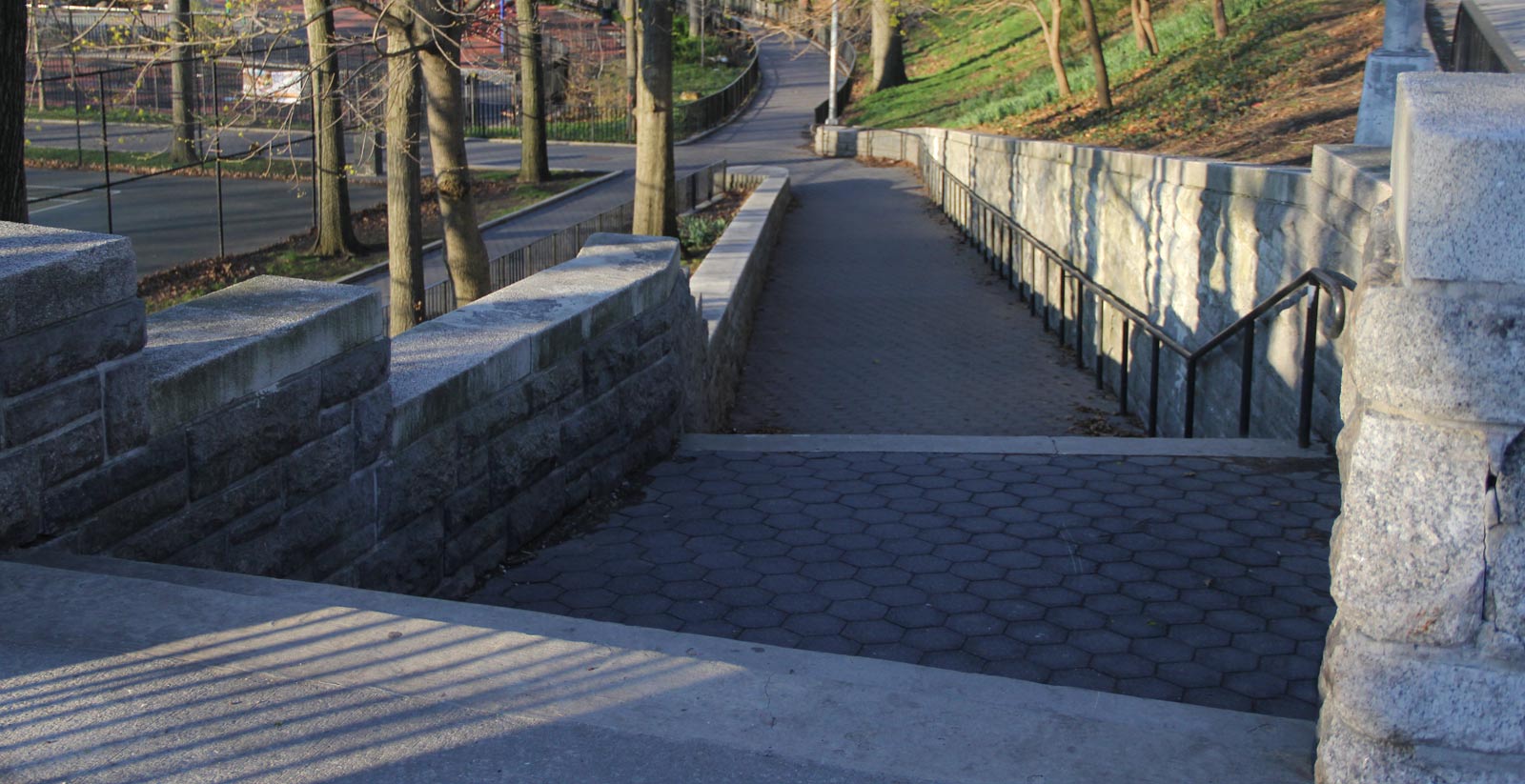 Oval Park, May 2017: WPA stonework from the 1930s. The stairs and ramp connect the upper level to the lower level. The lower (inner) promenade is seen at center top.
