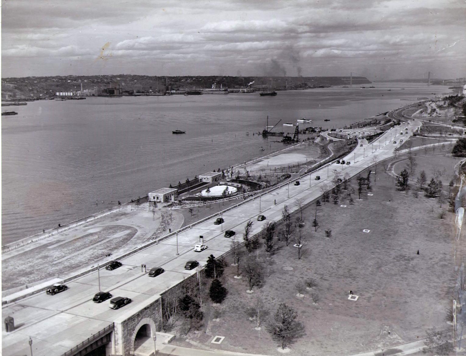 Riverside Park and the Henry Hudson Parkway on December 6, 1937, shortly after its opening on October 12, 1937, looking north from West 72nd Street. At the bottom left, the pedestrian underpass that provides access to the Hudson River. On the right, the newly reconstructed Riverside Park, bare except for some newly planted trees (compare with same area today). Left of the new highway: the 400-meter running track and concrete bleachers, then the comfort stations and playground at about 76th Street; then some athletic fields still taking shape; then the 79th Street Boat Basin and Rotunda, still under construction. Off in the distance: the George Washington Bridge.