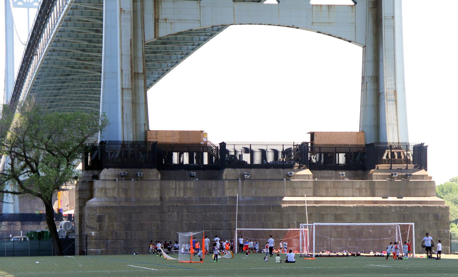 The construction of Triborough Bridge went hand in hand with making Randall's Island a place where children could play in its shadow. (Actually, the area pictured here was Ward's Island when the bridge was built, but later the channel separating it from Randall's Island, Little Hell's Gate, was filled in creating one big Randall's island at some point in the 1960s. Ward's Island was connected to East 103rd Street in Manhattan it 1951 by Ward's Island Bridge, a lift bridge opened for pedestrians only.)