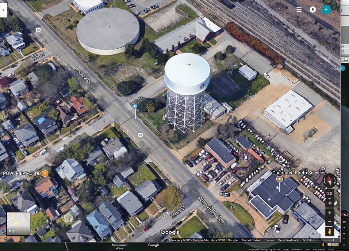 Water tower on Warwick Boulevard between 59th and 60th Streets. ”The buildings and the [round] tank [to the upper left in the picture] were once part of an administration and operations complex that existed on the site for many years (the round structure ... is our [3-million gallon] 60th Street Ground Tank). Waterworks' operations were gradually moved to other locations; the last of our employees were relocated from this facility in 2014 ... The ground storage tank was not a PWA project. It was originally built circa 1918-19, when Newport News became a Point of Embarkation for the military during WWI. The ground storage tank was repaired and an 11-stall brick garage was built on the 60th street property during the mid-1930s; however, it is unclear in the Waterworks history (from which I've taken much of this information) if these were PWA-funded projects. The building that later housed the Engineering and Billing Departments was not constructed until 1946.”[1]